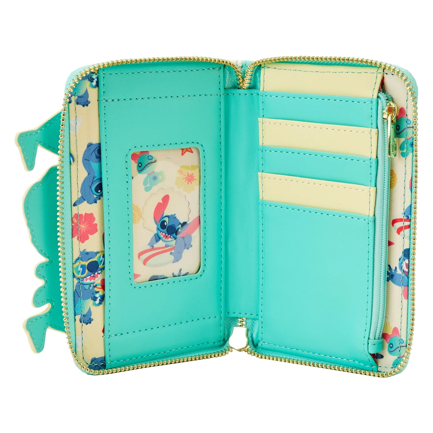 Op de voorkant lijkt Stitch klaar om in een perfect gebeeldhouwd zandkasteel te lopen, zijn geappliqueerde gezicht en armen steken eroverheen. Scrump ligt net binnen de kasteeldeur. Op de achterkant maakt Stitch een toegift, surfend op de golven. Binnenin zijn er 4 sleuven voor het vasthouden van kaarten en 1 doorzichtige sleuf voor het weergeven van uw ID. Een gestanste vorm van een schelp voegt een sfeer van zee aan toe. Ontsnap aan de dagelijkse sleur en ga op weg naar nieuwe avonturen.