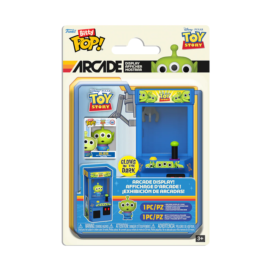 De wereld van POP! wordt groter – en kleiner – met Bitty POP! verzamelobjecten! Breid je Disney Pixar Toy Story collectie uit met deze glow-in-the-dark Bitty POP! Arcade Alien! Bitty POP! figuur is verpakt in een harde acryl display case met een afneembare onderkant. De afneembare onderkant dient tevens als een acryl basis, waaraan de Bitty POP! figuur wordt bevestigd. Haal Bitty POP! Alien uit zijn case zodat hij zijn plaats kan innemen in de Bitty POP! Arcade Display! De Bitty POP! case kan worden opgeborgen in de Bitty POP! Arcade Display, direct onder POP! Alien. Vinyl figuren zijn ongeveer 0,9 en 3,5 inch (2,3 en 8,9 cm) hoog.
