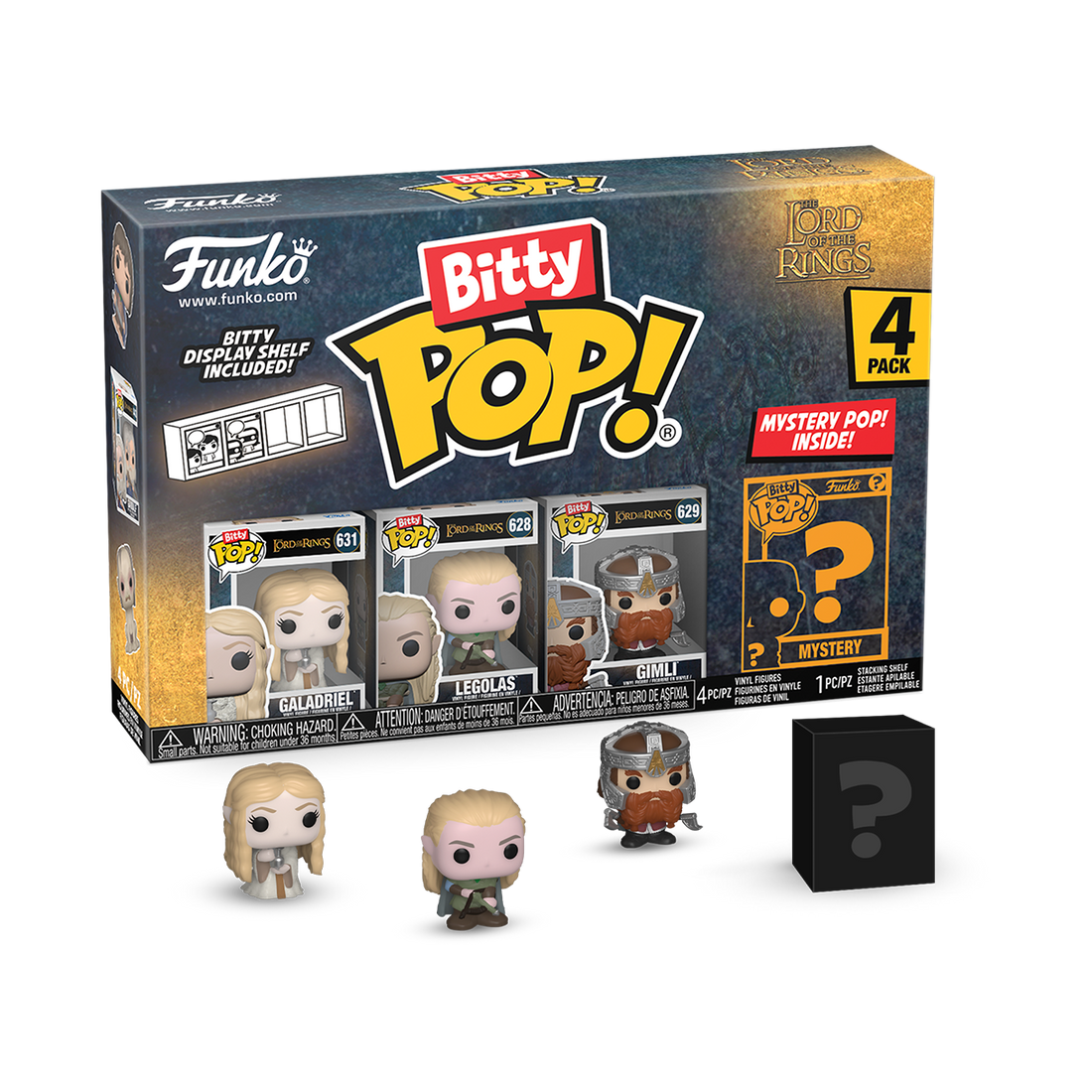 Dit 4-pack bevat Bitty Pop! Galadriel™, Bitty Pop! Legolas™, Bitty Pop! Gimli™ , en een mysterieuze Bitty Pop! figuur.