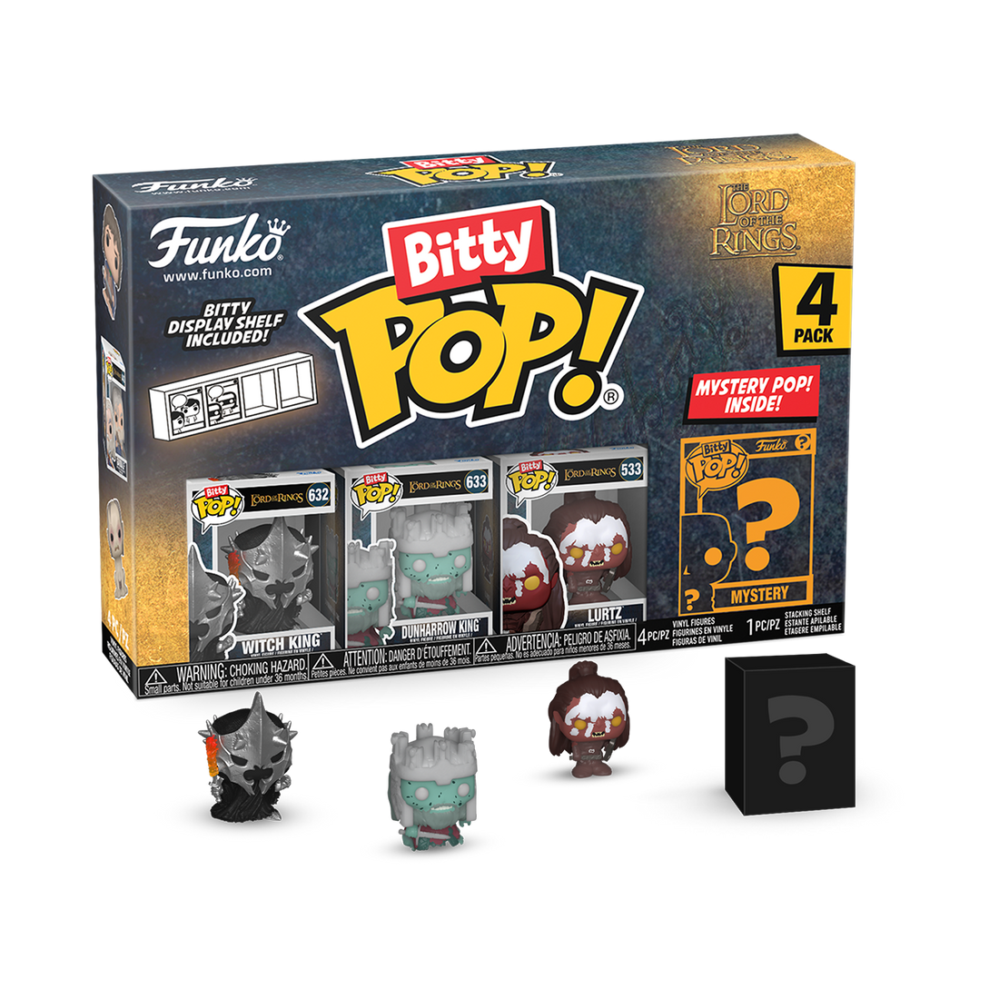 Dit 4-pack bevat Bitty Pop! Witch King™, Bitty Pop! Dunharrow King™, Bitty Pop! Lurtz™ , en een mysterieuze Bitty Pop! figuur.