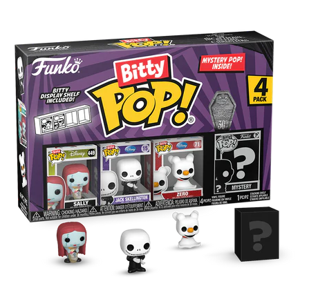 Dit 4-pack bevat Bitty Pop! Sally, Bitty Pop! Jack Skullington, Bitty Pop! Zero, en een mysterieuze Bitty Pop! figuur. De mogelijke mysterieuze Bitty Pops! zijn de Mayor (lachend), Snowman Jack, Oogie Boogie (met bugs) of Harlequin Demon.