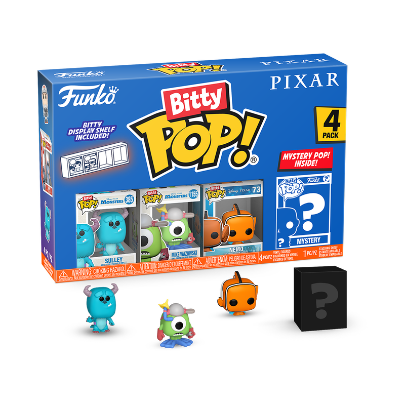 Dit 4-pack bevat Bitty Pop! Sulley, Bitty Pop! Mike Wazowski , Bitty Pop! Nemo, en een mysterieuze Bitty Pop! figuur.
