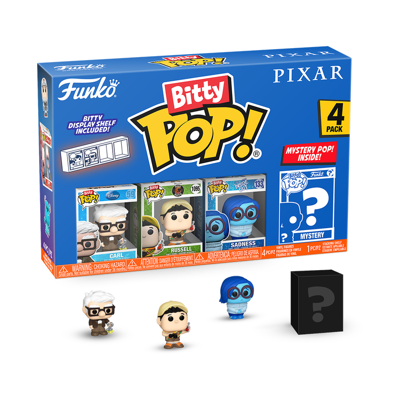 Dit 4-pack bevat Bitty Pop! Carl, Bitty Pop! Russell, Bitty Pop! Sadness, en een mysterieuze Bitty Pop! figuur.