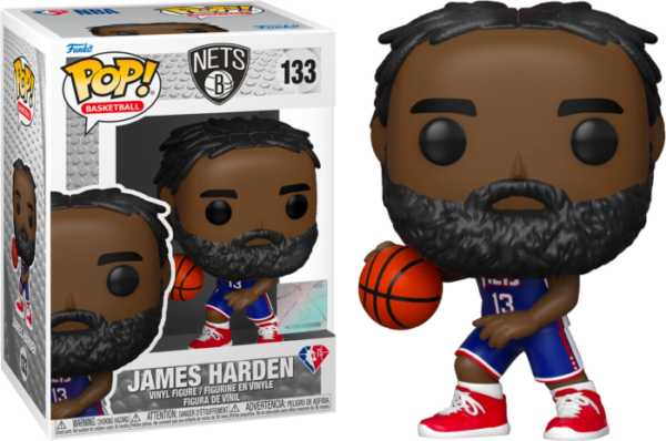 Deze pop! toont James Harden van de Brooklyn Nets, compleet met zijn Nets City Edition-uniform en met een basketbal in de hand.