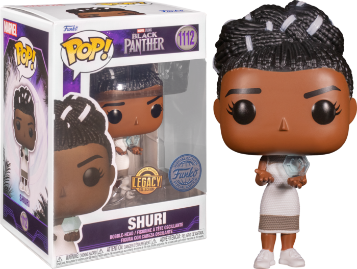 Deze pop! toont Shuri, de prinses van Wakanda, haar prachtige witte jurk draagt.