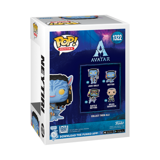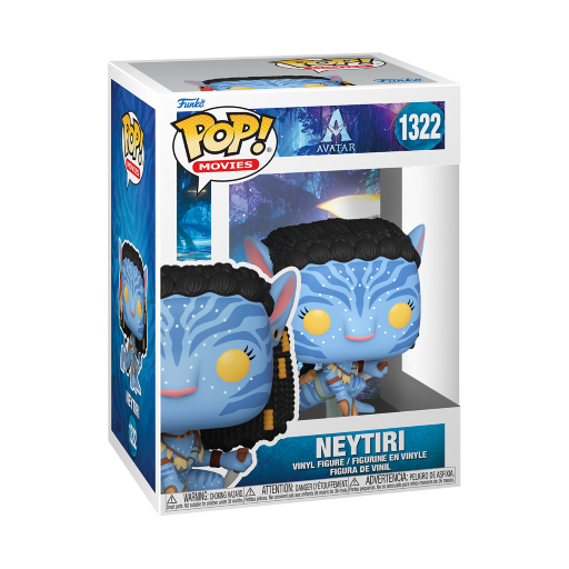 Funko’s pop! van Neytiri uit de film Avatar uit 2009 omvat haar blauwe huid, unieke markeringen die ingewikkeld over haar figuur zijn geregen, gele ogen en gevlochten haar. Haar lichaam is versierd met de sieraden en kledingstukken die haar mensen maken. Met de staart naar de zijkant gezwaaid, hurkt ze met een mes in de ene hand en balanceert op de grond met de andere.