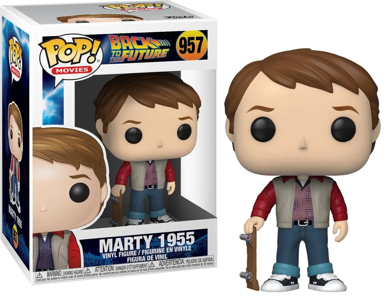 Hier hebben we Marty McFly, in zijn outfit uit 1955 uit de eerste film, met zijn geïmproviseerde skateboard in de hand. Vervoer de Marty McFly in 1955 Outfit Pop! Vinylfiguur vandaag nog in je Funko-collectie!