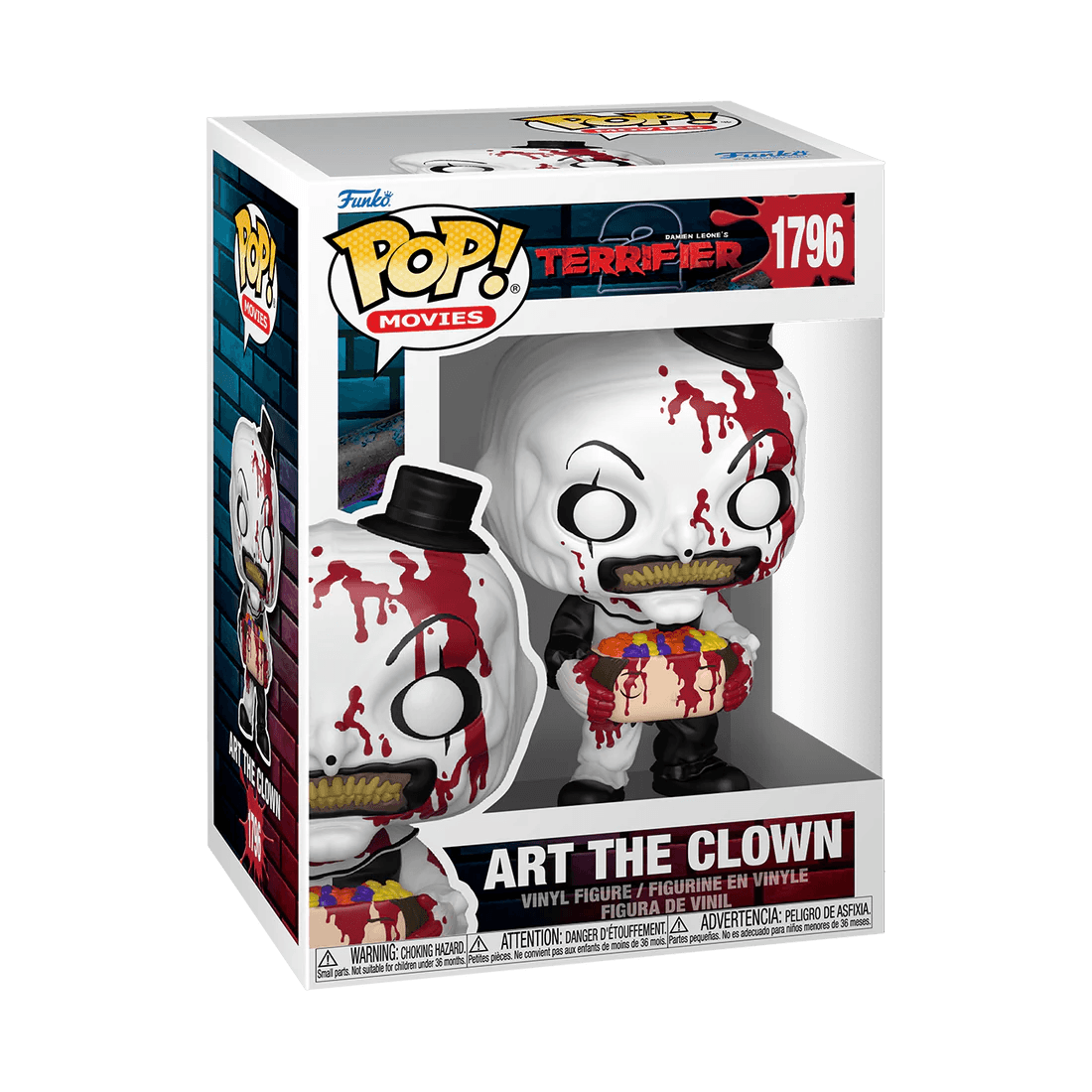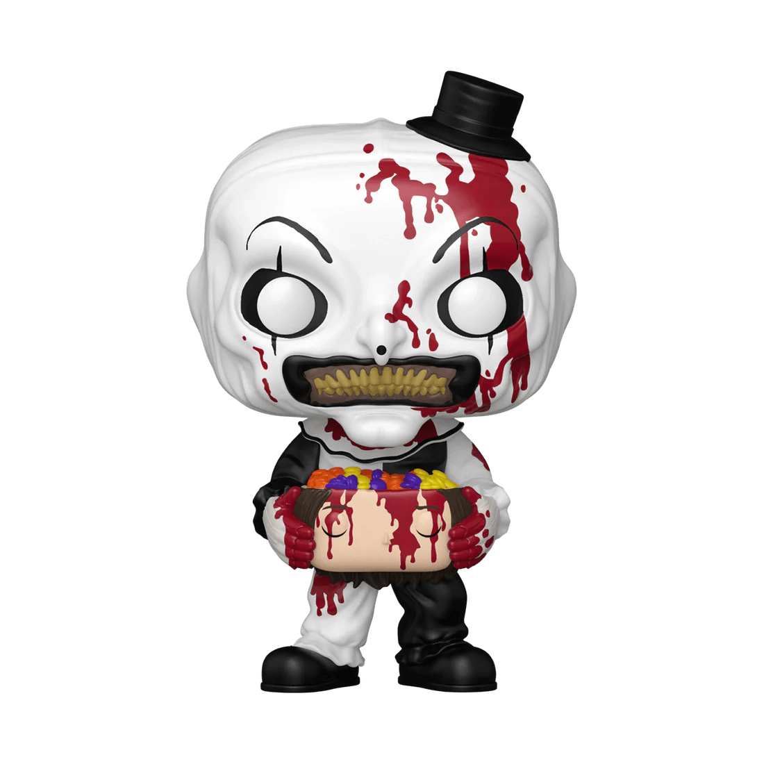 Je horrorcollectie snakt naar een angstaanjagend leuke nieuwe aanwinst! POP! Art de Clown is gearriveerd om je Terrifier 2-set compleet te maken met een met snoep gevuld hoofd in de hand.