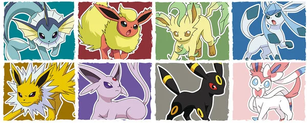Er staan verschillende Eevee Evolutions op afgebeeld.