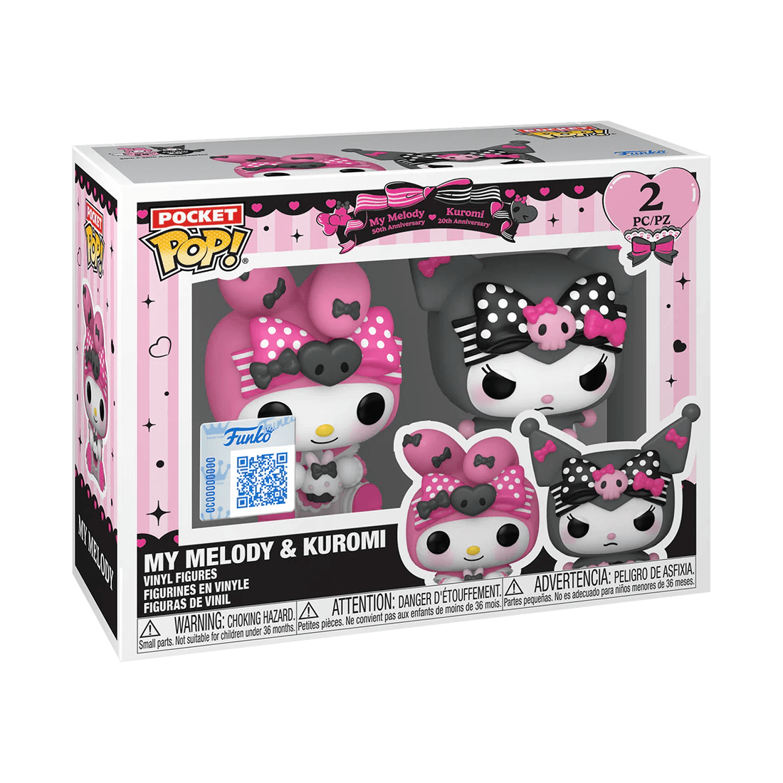 Verzamel je Hello Kitty™ en Friends-collectie en maak je klaar om twee heel bijzondere gelegenheden te vieren: het 50-jarig jubileum van My Melody™ en het 20-jarig jubileum van Kuromi™! Deze exclusieve 2-pack bevat Pocket POP! My Melody™ en Pocket POP! Kuromi™ in schattige roze en zwarte outfits – perfect voor een feestje met je Sanrio®-collectie!