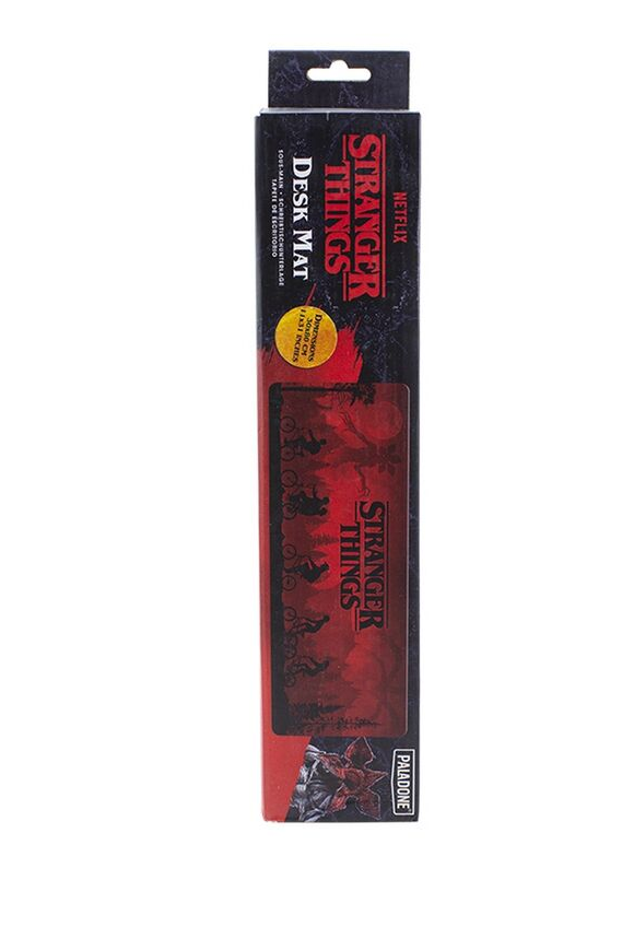 De zwart-rode rubberen bureaumat is voorzien van het Stranger Things-logo tegen een landelijke Hawkins-scène. Langs de onderkant van de mat staan silhouetten van zes van de hoofdpersonen op fietsen – Lucas, Mike, Eleven, Dustin, Will en Max. De Demogorgon loert op de achtergrond.